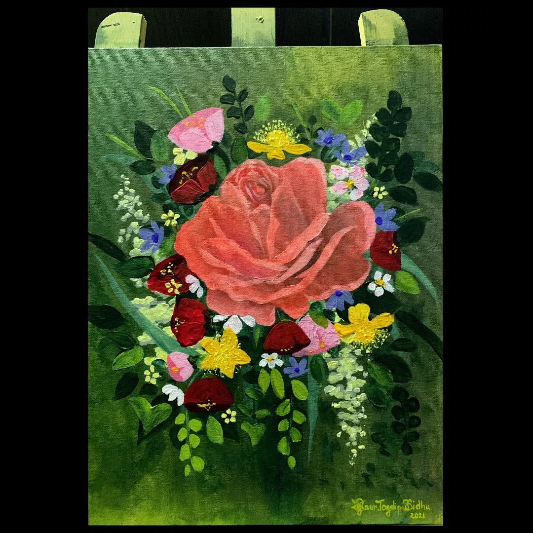 Anything that’s three in number reminds me of both my sisters. I made this painting for them and for me. I even named these roses Pam, Amy and Harsimran. I used a picture I took in my garden of a rose plant and I knew I had to paint them. This painting is symbolic of how beautiful adoption is and I can never seem to count my blessings when I see these roses.